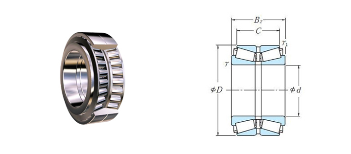 雙列圓錐滾子軸承的外圈或內(nèi)圈是一個(gè)整體,兩個(gè)內(nèi)圈或外圈小端面相近,中間有隔圈,游隙是靠隔圈的厚薄來調(diào)整的, 也可用隔圈的厚薄來調(diào)整雙列圓錐滾子軸承的預(yù)過盈,雙列圓錐滾子軸承通常用于齒輪箱、起重設(shè)備、軋鋼機(jī)和采礦機(jī)械,例如隧道掘進(jìn)機(jī)。